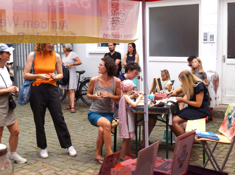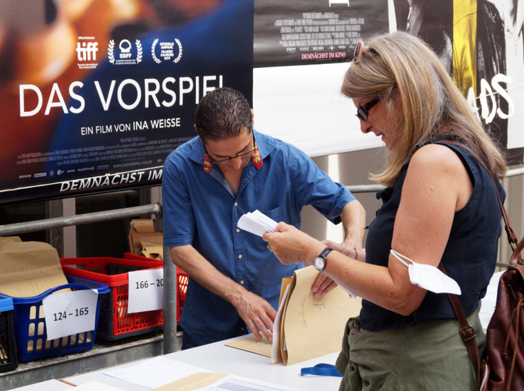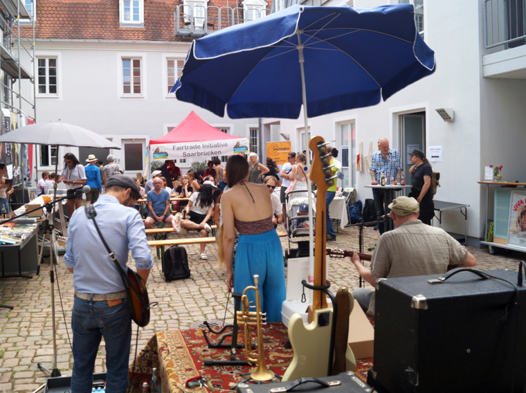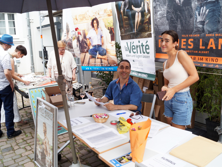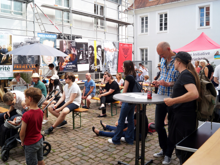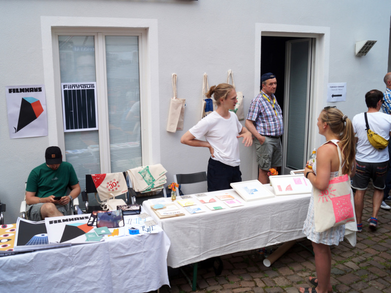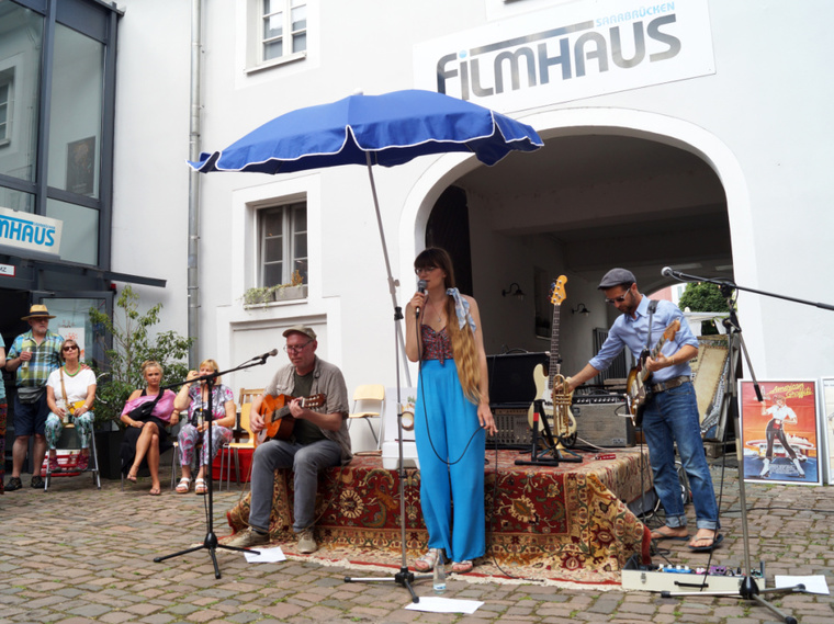 Im Rahmen des diesjährigen Mitsommerwochenendes im Quartier Mainzer Straße hat das Filmhaus mit einem Filmplakatflohmarkt im Innenhof eine alte Tradition wieder aufleben lassen. Mit weiteren Ständen, Sitzgelegenheiten sowie einem Getränke- und Fingerfoodangebot hatte das Filmhaus zum feiern eingeladen. Ebenfalls auf dem Programm: Livemusik mit der Band „Me in the Forest".